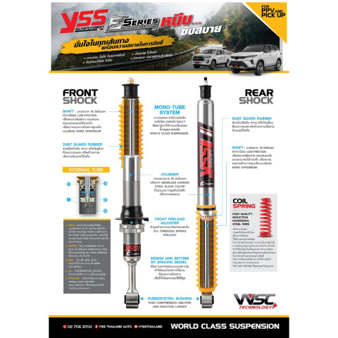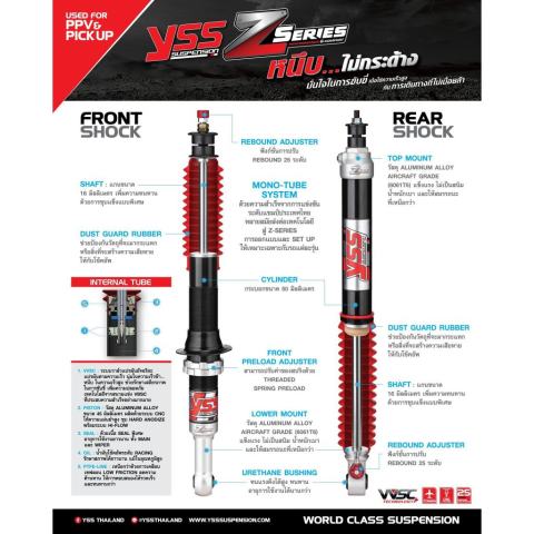 Z-Series (Monotube): ปรับรีบาวน์ได้ 30 ระดับ ฟีลลิ่งนุ่มในช้า หนึบในเร็วด้วย VVSC เหมาะทั้งผู้ขับและผู้โดยสาร (รับประกัน 2 ปี / 40,000 กม.)