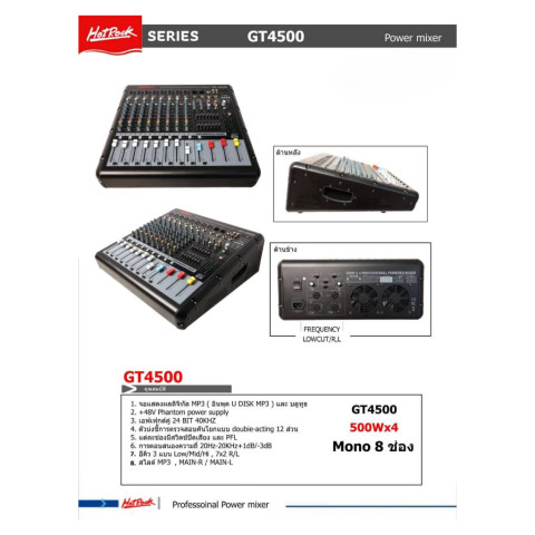 HOTROCK GT-4500A Power Mixer 4CH USB/BT 4x500W เพาเวอร์มิกเซอร์กำลังขับสูง สำหรับงานเสียงกลางแจ้ง งานอีเวนต์ เวทีเล็ก-กลาง ห้องซ้อม หรือคาราโอเกะ มาพร้อมภาคขยายในตัว 4 แชนแนล 500W x4 และระบบเล่นเพลง MP3 ผ่าน USB (U Disk) รวมถึง Bluetooth ช่วยให้เชื่อมต่อและควบคุมเสียงได้สะดวกในเครื่องเดียว