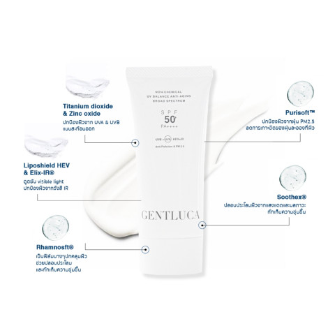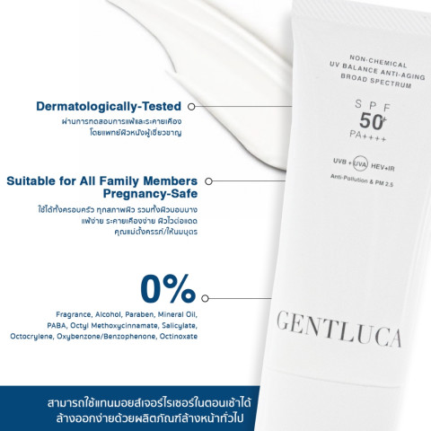 [Free] Gentluca UV Balance Anti-Aging Broad Spectrum SPF50+ PA++++ (PPD 43.4) ขนาด 5g กันแดดบำรุงผิวสูตร 100% Non-Chemical ที่ช่วยให้ผิวชุ่มชื้น แข็งแรง พร้อมปกป้องครบทั้ง UVA/UVB, Blue Light (HEV), Infrared (IR), Ultra-Long UVA (380–400 nm) และมลภาวะ PM2.5 เนื้อบางเบา เกลี่ยง่าย สบายผิว ไม่ทิ้งคราบขาว และล้างออกง่าย ใช้ได้ทั้งครอบครัว รวมถึงผิวบอบบางแพ้ง่าย