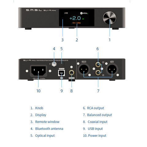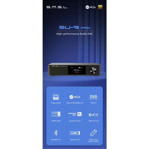 SMSL SU-9 PRO ตัวถอดรหัสเสียง (DAC) ระดับไฮไฟที่อัปเกรดด้วยชิป ES9039MPRO ให้รายละเอียดเสียงคมชัด เวทีเสียงโปร่ง และไดนามิกที่เป็นธรรมชาติ รองรับไฟล์ความละเอียดสูงสุด 768kHz/32Bit และ DSD512 พร้อมการถอดรหัส MQA & MQA-CD สำหรับการสตรีมเพลงคุณภาพสูงแบบเต็มอรรถรส ครบเครื่องทั้งการเชื่อมต่อแบบมีสายและไร้สายด้วย Bluetooth 5.0 ใช้งานง่ายด้วย รีโมตคอนโทรล เหมาะสำหรับยกระดับชุดเครื่องเสียงบ้าน คอมพิวเตอร์ หรือระบบสตรีมมิงให้เสียงใสขึ้นทันที