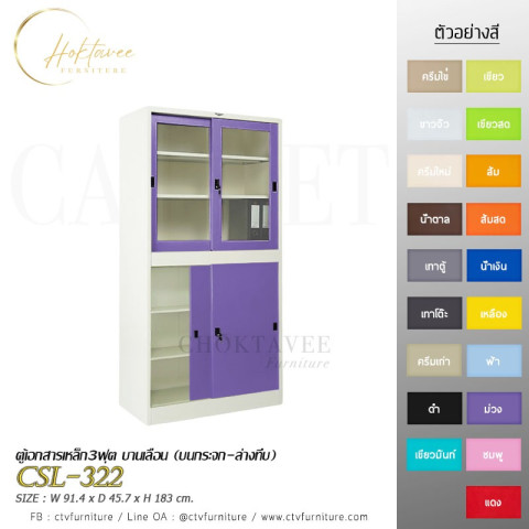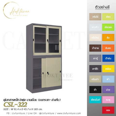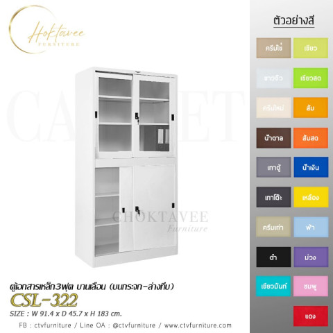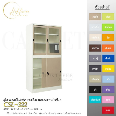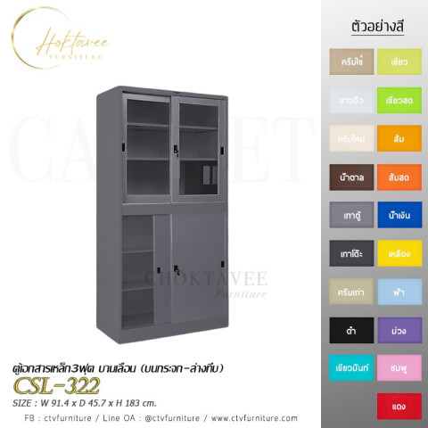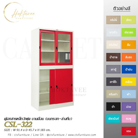 ตู้เอกสารเหล็ก 3 ฟุต บานเลื่อน (บนกระจก-ล่างทึบ) รุ่น CSL-322 ราคา 7,314.00 บาท (ราคารวม VAT) ตู้เก็บเอกสารและของใช้สำหรับบ้าน/ออฟฟิศ ดีไซน์บานเลื่อนประหยัดพื้นที่ มองเห็นของด้านบนด้วยกระจกใส และซ่อนของด้านล่างให้เป็นระเบียบ พร้อมชั้นปรับระดับได้ จัดเก็บได้จุใจเป็นสัดส่วน