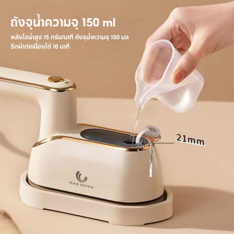 ถังน้ำ 150ml ใช้ไอน้ำต่อเนื่องได้สูงสุดประมาณ 10 นาที รีดได้หลายชิ้นต่อการเติมหนึ่งครั้ง