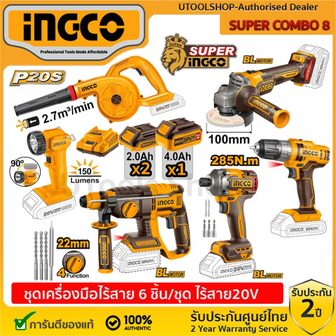 Ingco Super Combo Set 8 ชุดเครื่องมือช่างไร้สาย 20V สุดคุ้ม รวมเครื่องมือหลักที่ใช้งานจริงครบทั้งงานเจาะ ขัน เจียร์ สกัด เป่าทำความสะอาด และส่องสว่างในชุดเดียว เหมาะสำหรับช่างมืออาชีพ ผู้รับเหมา และงานซ่อมบำรุงภายในบ้านที่ต้องการความคล่องตัวแบบไร้สาย พร้อมแบตเตอรี่หลายความจุให้เลือกใช้ตามลักษณะงาน