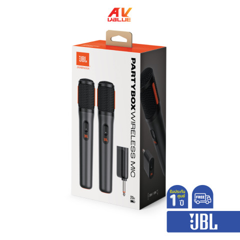 JBL PartyBox Wireless Mic - Digital Wireless Microphones ไมโครโฟนคู่ไร้สายสำหรับสายคาราโอเกะและงานปาร์ตี้ ให้เสียงร้องคมชัดใส ลดเสียงรบกวนได้ดี ใช้งานง่ายแบบ Plug and Play เพียงเสียบดองเกิลก็พร้อมสนุกได้ทันที เหมาะทั้งการใช้งานร่วมกับ ลำโพง JBL PartyBox Series หรืออุปกรณ์ที่มีช่องเสียบไมโครโฟนทั่วไป พร้อมสัญญาณไร้สาย 2.4GHz ที่เสถียรในระยะสูงสุด 30 เมตร
