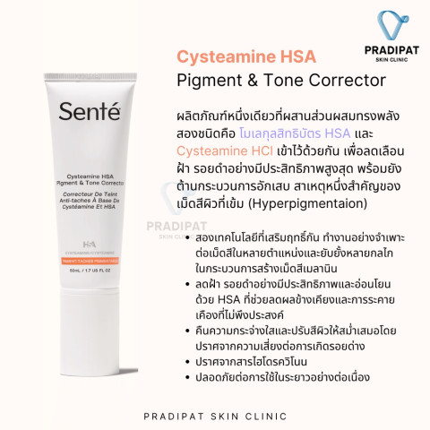 Sente Cysteamine HSA Pigment & Tone Corrector นวัตกรรมเวชสำอาง (medical-grade skincare) จากสหรัฐอเมริกา เพื่อการดูแล “ฝ้า รอยดำ และเม็ดสีผิวไม่สม่ำเสมอ” อย่างมีประสิทธิภาพและอ่อนโยน ด้วยการผสานพลัง 5% Cysteamine HCl (มาตรฐานใหม่ของการดูแลฝ้า) เข้ากับ Heparan Sulfate Analog (HSA) เอกสิทธิ์เฉพาะจาก SENTÉ® ช่วยลดเลือนจุดด่างดำ ปรับโทนสีผิวให้ดูสม่ำเสมอ กระจ่างใสขึ้น พร้อมดูแลเกราะปกป้องผิวให้แข็งแรง ลดโอกาสระคายเคือง เหมาะสำหรับผู้ที่กังวลเรื่องเม็ดสีและต้องการผลลัพธ์ที่ปลอดภัยในระยะยาว