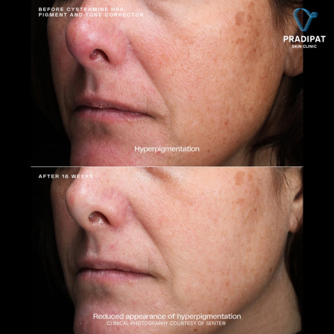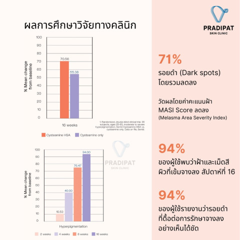 พบว่า 71% รอยดำลดลงในกลุ่ม Cysteamine HSA (ให้ผลดีกว่าเมื่อเทียบกับ Cysteamine อย่างเดียว)