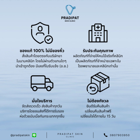 จัดจำหน่ายโดย คลินิกผิวหนังประดิพัทธ์ และเป็นผลิตภัณฑ์ที่จ่ายให้คนไข้จริงในคลินิก