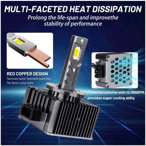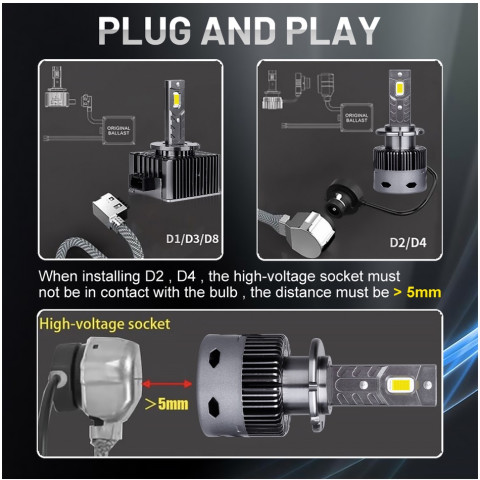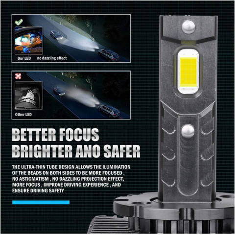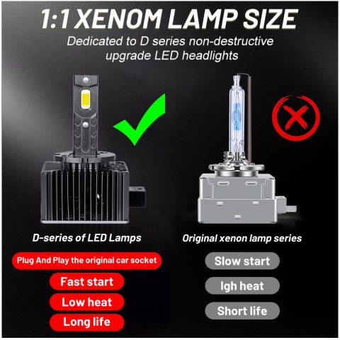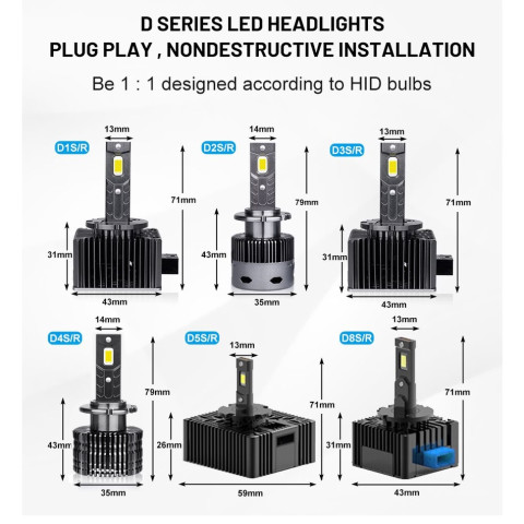 ไฟหน้า LED ซีรีส์ D สำหรับรถเดิม HID Xenon อัปเกรดความสว่างแบบจัดเต็ม ติดตั้งง่ายแบบ Plug & Play ใช้ชิป CSP สองด้าน ให้ลำแสงแน่น ชัด ส่องไกล เหมาะสำหรับผู้ที่ต้องการเพิ่มทัศนวิสัยตอนกลางคืนและขับขี่ได้มั่นใจขึ้น โดยมาเป็นชุด 2 ชิ้น พร้อมระบบ CANBUS ลดปัญหาแจ้งเตือนหน้าปัดและสัญญาณรบกวนวิทยุ
