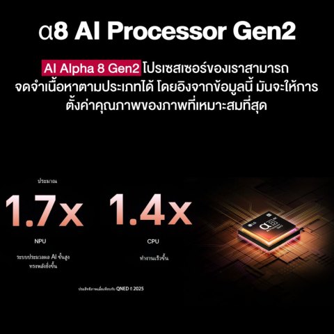 หน้าจอ 55 นิ้ว ความละเอียด 4K Ultra HD (3,840 x 2,160) ผสานเทคโนโลยี QNED MiniLED พร้อม Dynamic QNED Color ให้สีสด คอนทราสต์ดี และรายละเอียดชัดในทุกฉากชิปประมวลผล α8 AI Processor 4K Gen2