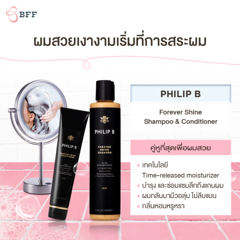 Philip B. - Forever Shine Shampoo แชมพูฟอร์เอเวอร์ ชายน์ แชมพูบำรุงผมระดับพรีเมียมที่ออกแบบมาเพื่อคืนความเงางามแบบ “ผมสุขภาพดี” ให้เส้นผมในทุกวัน พร้อมช่วยให้ผมนุ่มลื่น ดูมีวอลลุ่ม และฟื้นบำรุงผมที่แห้งเสียจากความร้อน การทำสี หรือมลภาวะ ให้กลับมาดูแข็งแรง เรียบสวย จัดทรงง่ายขึ้น