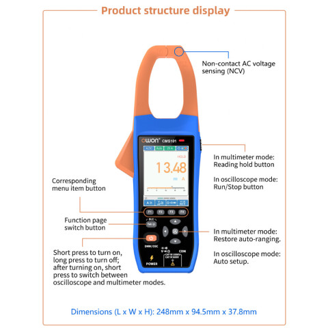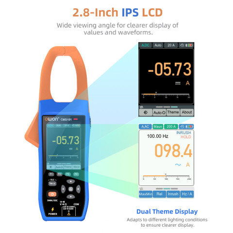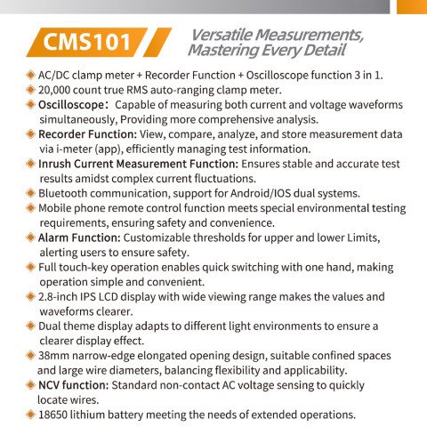 OWON CMS101 3-in-1 เครื่องมือวัดระดับมืออาชีพที่รวม แคลมป์มิเตอร์ AC/DC + เครื่องบันทึกข้อมูล (Recorder) + ออสซิลโลสโคป (Oscilloscope) ไว้ในเครื่องเดียว เหมาะสำหรับงานไฟฟ้า งานซ่อมบำรุง งานตรวจเช็กระบบ และงานภาคสนามที่ต้องการความแม่นยำ พร้อมการเชื่อมต่อ Bluetooth (BLE) เพื่อดูค่า/กราฟ/บันทึกเป็นไฟล์ผ่านแอปได้สะดวก