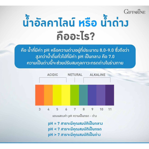 น้ำอัลคาไลน์ (Alkaline Water) ค่าความเป็นด่าง pH 8.0–9.0 ช่วยปรับสมดุลและต้านอนุมูลอิสระ