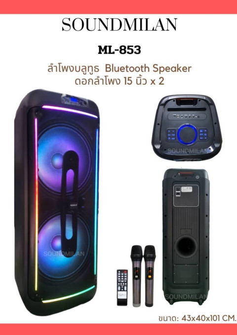 ลำโพงบลูทูธ ขนาดยักษ์ รุ่น ML-853 พลังเสียงสะใจสำหรับสายปาร์ตี้ งานอีเวนต์ หรือเปิดเพลงในร้าน—ตัวสูงประมาณ 1 เมตร จากพื้น พร้อมดอกลำโพง 15 นิ้ว x 2 ดอก ให้เบสแน่น กระหึ่มเต็มพื้นที่ เสริมบรรยากาศด้วย ไฟแสงสีวิบวับปรับโหมดได้หลายแบบ จะเปิด-ปิดก็ได้ตามต้องการ