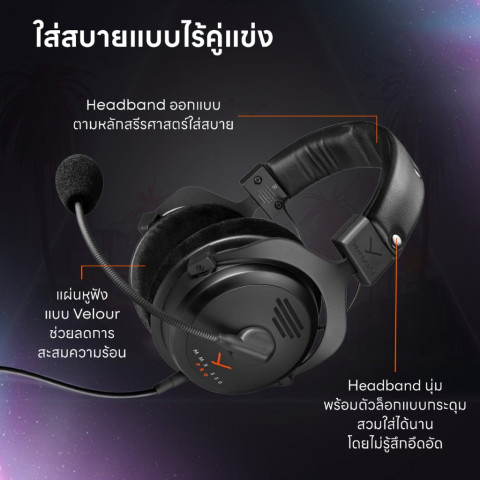 ใส่สบายต่อเนื่อง ด้วยแผ่นรองหูผ้ากำมะหยี่ (Velour) + เมมโมรี่โฟม พร้อมรอยเว้าลดแรงกดบริเวณกระหม่อม ช่วยลดอาการล้าเมื่อใส่นาน