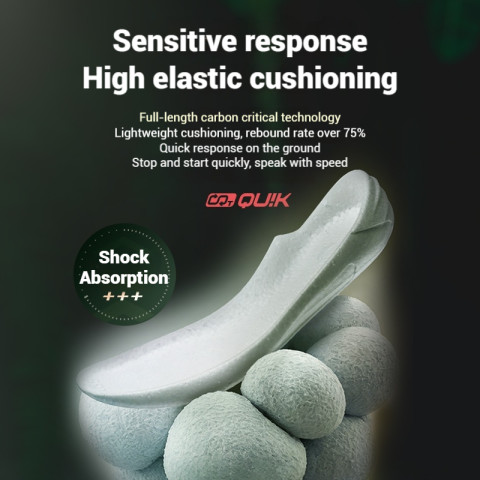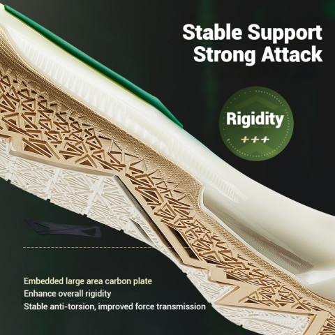 ฝัง แผ่นคาร์บอน TPU บริเวณช่วงกลางเท้า ช่วยเพิ่มแรงดีดตัวในจังหวะสสปีดและกระโดด พร้อมทั้งเสริมความมั่นคง ลดการบิดตัวของเท้าในจังหวะหยุดและเบรกกะทันหัน เหมาะกับผู้เล่นที่ต้องการทั้งสปีดและการทรงตัวที่ดีเยี่ยมพื้นรองเท้ายางใสทนต่อการสึกหรอ ยึดเกาะดีเยี่ยม