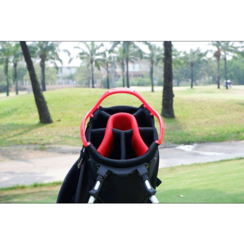 ตัวถุงออกแบบด้านบนเป็นช่องแบ่งไม้กอล์ฟ 8 ช่อง พร้อมที่จับในตัวด้านหน้าและด้านบน ช่วยให้หยิบจับและยกเคลื่อนย้ายได้สะดวก โครงสร้างด้านข้างบุด้วยตาข่ายระบายอากาศสีเข้ากัน เพิ่มความสบายขณะสะพายและช่วยลดการอับชื้น เหมาะกับการออกรอบทั้งแบบเดินและขึ้นรถกอล์ฟ