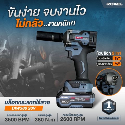 บล็อกกระแทกไร้สาย ROWEL รุ่น DIW380-S มอเตอร์ไร้แปรงถ่าน (Brushless Motor) ขนาด 20V มาพร้อมฟังก์ชัน 2 in 1 ใช้งานได้ทั้งหัวจับบล็อก 1/2" และหัวจับดอก 1/4" ให้แรงบิดสูงสุดถึง 380 Nm รองรับงานขัน – คลายสกรู น็อต และงานซ่อมบำรุงหลากหลายรูปแบบ ทั้งงานรถยนต์ งานช่าง งานโครงสร้าง และงานติดตั้งเฟอร์นิเจอร์ ใช้งานสะดวกไร้สาย เคลื่อนย้ายง่ายไม่เกะกะ พร้อมแบตเตอรี่ LI-ION 20V 4Ah จำนวน 2 ก้อน ใช้งานต่อเนื่องได้ยาวนาน คุ้มค่าทั้งประสิทธิภาพและราคาเพียง 5,200.00 บาท พร้อมรับประกันสินค้า 1 ปี