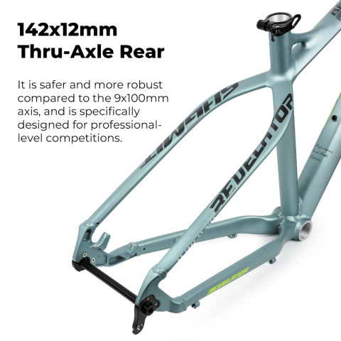 ด้านหลังใช้ระบบ แกนเพลาผ่าน (Thru-Axle) ขนาด 148 มม. ให้ความแข็งแรงและความแม่นยำของล้อที่เหนือกว่าระบบดรอปเอาต์แบบดั้งเดิม ช่วยให้การถ่ายแรง การเข้าโค้ง และการสปรินต์ทำได้อย่างเต็มประสิทธิภาพ เหมาะสำหรับผู้ที่ต้องการเฟรมที่พร้อมรองรับอุปกรณ์ระดับแข่งขันในอนาคต