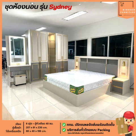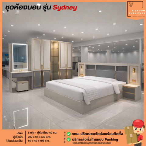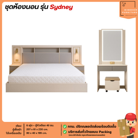 ชุดห้องนอน รุ่น Sydney | บิ๊กบูมเฟอร์นิเจอร์ ยกระดับห้องนอนให้ดูโมเดิร์นและใช้งานได้ครบในชุดเดียว ทั้งเตียง 6 ฟุตพร้อมตู้หัวเตียง ตู้เสื้อผ้าขนาดใหญ่ และโต๊ะแป้งกระจกไฟ LED ตอบโจทย์ทั้งการพักผ่อน การจัดเก็บ และการแต่งตัวได้อย่างลงตัว ในราคาคุ้มค่า 28,952.00 บาท