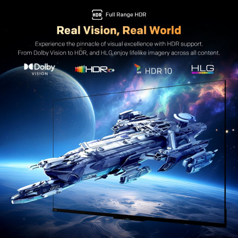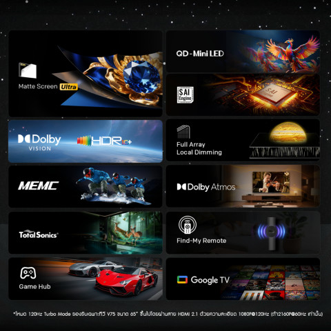 เทคโนโลยี Quantum Dot ให้ขอบเขตสีมากกว่า 90% Color Gamut สีสดมีชีวิตชีวา ผสาน Mini LED ที่ช่วยยกระดับคอนทราสต์และรายละเอียดในทุกฉาก พร้อมชิปกำเนิดแสงแบบ 16-Crystals-Light-Emitting-Chips สว่าง เสถียร และทนทานGoogle TV (Android 14) แอพครบ ใช้งานลื่น