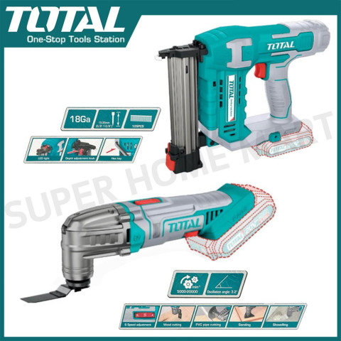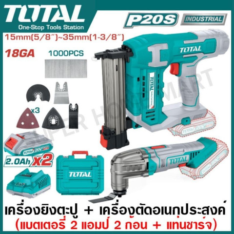Total ชุดคอมโบเครื่องมือไร้สาย 20V รุ่น TOSLI24021 คุ้มจบงานช่างในชุดเดียว ทั้ง เครื่องยิงตะปูขาเดี่ยว สำหรับงานไม้/บัว/กรอบ/เฟอร์นิเจอร์ และ เครื่องตัด-ขัดอเนกประสงค์ สำหรับตัด เซาะ แซะ ขัด เก็บรายละเอียดงานได้อย่างมืออาชีพ มาพร้อม แบตเตอรี่ 2 ก้อน + แท่นชาร์จ ใช้งานต่อเนื่อง สลับแบตได้สะดวก เหมาะทั้งช่างมืออาชีพและงาน DIY ภายในบ้าน