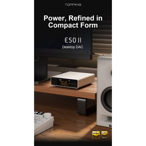 [ประกันศูนย์ไทย] Topping E50II Desktop DAC ชิป AK4497S VELVET SOUND™ ยกระดับทุกการฟังให้คมชัด สมจริง และครบทุกย่านเสียงด้วย DAC ตั้งโต๊ะรุ่นใหม่จาก Topping ที่รวมความละเอียดระดับไฮเอนด์ การเชื่อมต่อครบทั้งมีสาย/ไร้สาย และการควบคุมที่ใช้งานง่ายไว้ในเครื่องเดียว เหมาะทั้งสายฟังเพลงจริงจังและผู้ใช้งานระบบเสียงที่ต้องการความเสถียรและความแม่นยำสูง