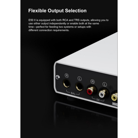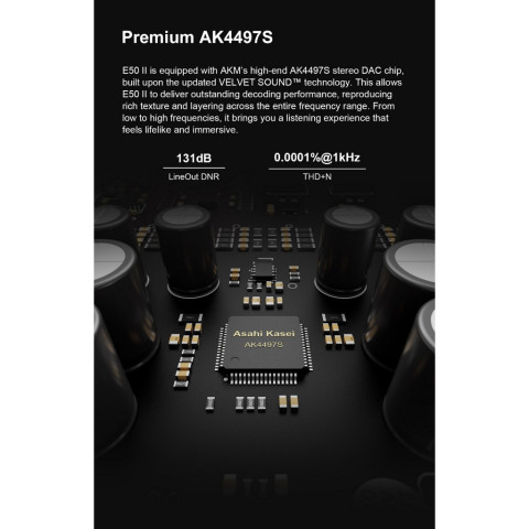 หัวใจของ E50II คือชิป AKM AK4497S บนเทคโนโลยี VELVET SOUND™ ให้เนื้อเสียงละเอียด โปร่งใส และถ่ายทอดบรรยากาศได้เป็นธรรมชาติ ตั้งแต่เบสลงลึกไปจนถึงปลายแหลมที่ใสสะอาด พร้อมวงจร TopSync (FPGA+PLL) + JitterNull ช่วยลด Jitter ได้ต่ำมากเพื่อสัญญาณที่นิ่งและเที่ยงตรง อีกทั้งยังรองรับไฟล์ความละเอียดสูงผ่าน USB ได้ถึง PCM 768kHz/32-bit และ DSD64–DSD512 (Native)
