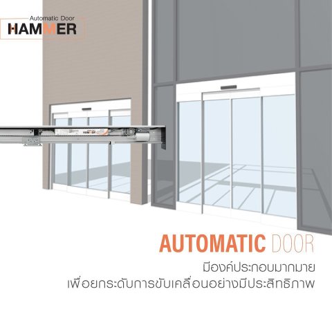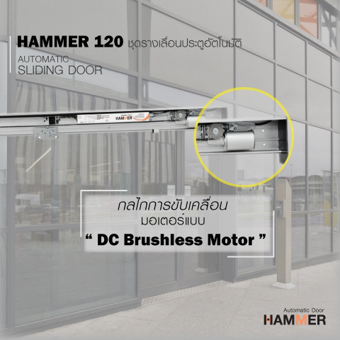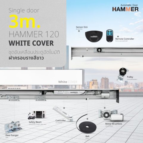 ประตูอัตโนมัติ Auto Door HAMMER 120 (Single Sliding Door) ชุดรางบานเลื่อนเดี่ยว รางยาว 3 เมตร สีขาว ดีไซน์เรียบสวย เหมาะสำหรับร้านค้า ออฟฟิศ คลินิก อาคารพาณิชย์ หรือพื้นที่ที่ต้องการความสะดวกในการเข้า-ออกแบบมืออาชีพ มาพร้อมมอเตอร์ DC Brushless ทำงานนิ่ง เงียบ ทนทาน และระบบตรวจเช็คระดับการเปิดอัตโนมัติเมื่อเริ่มใช้งานครั้งแรก รองรับการใช้งานได้ทั้ง บานกระจกเปลือย / บานเฟรมอลูมิเนียม / บานไม้