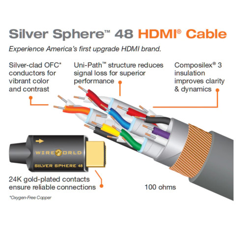 Wireworld HDMI Silver Sphere™ 48 HDMI Cable (3 เมตร) สาย HDMI เกรดพรีเมียมที่ออกแบบมาเพื่อรีดประสิทธิภาพการเชื่อมต่อ Ultra High Speed สำหรับ 4K และ 8K ได้อย่างเต็มศักยภาพ รองรับแบนด์วิดท์สูงสุด 48Gbps เพื่อภาพคมชัด ลื่นไหล สีสันลึก และเสียงที่สะอาดขึ้น เหมาะสำหรับทีวี/โปรเจกเตอร์ 8K, เครื่องเล่นเกมคอนโซลรุ่นใหม่, AV Receiver และระบบโฮมเธียเตอร์ที่ต้องการสัญญาณคุณภาพสูงอย่างแท้จริง