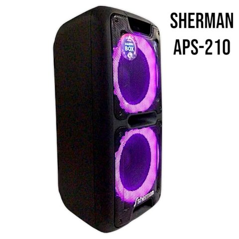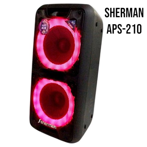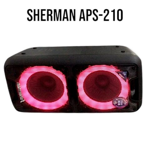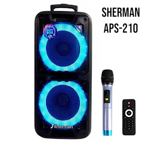 SHERMAN APS-210 ลำโพงปาร์ตี้บลูทูธแบบล้อลาก เบสคู่ขนาด 10 นิ้ว กำลังขับ 80W (RMS) พร้อมไมโครโฟนไร้สาย UHF และแบตเตอรี่ในตัว เหมาะทั้งงานปาร์ตี้ งานอีเวนต์ งานพรีเซนต์ขายสินค้า หรือคาราโอเกะ เคลื่อนย้ายสะดวก ใช้งานได้ทั้งเสียบปลั๊กและใช้ไฟจากแบตเตอรี่