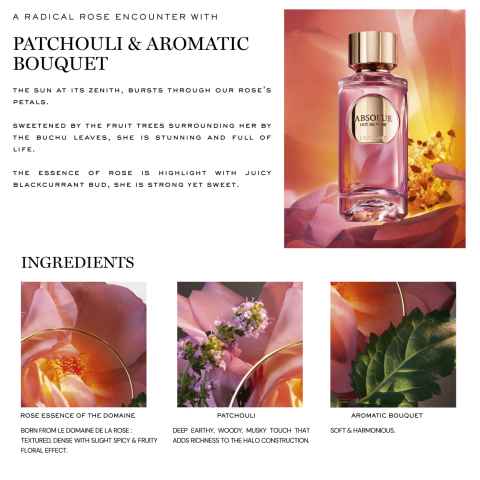 คอนเซ็ปต์คอลเลกชัน: Absolue Les Parfums คือคอลเลกชันน้ำหอมสุดล้ำที่ยกกุหลาบจาก Domaine เป็นหัวใจหลัก โดยมีทั้งหมด 11 กลิ่น เผยเสน่ห์ของกุหลาบเซนติฟอเลียในมุมที่ไม่เคยสัมผัสมาก่อน