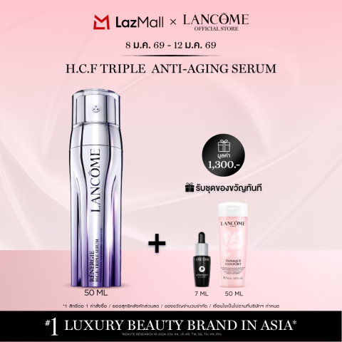 LANCOME RÉNERGIE H.C.F. TRIPLE SERUM 50 ML เซรั่มผสาน 3 พลังเพื่อการดูแลผิวแบบ Anti-Aging ครบจบในหนึ่งเดียว ด้วยนวัตกรรมสิทธิบัตร “ทริปเปิลโดส (Triple Dose)” ที่ผสานส่วนผสมทรงประสิทธิภาพซึ่งโดยปกติรวมไว้ในสูตรเดียวกันได้ยาก ให้ทำงานร่วมกันอย่างเชี่ยวชาญในรูปแบบผสมสดก่อนใช้ เพื่อฟื้นบำรุงผิวแบบล้ำลึก 3 ระดับ—ผิวอิ่มฟู ริ้วรอยดูจางลง และจุดด่างดำดูดีขึ้น