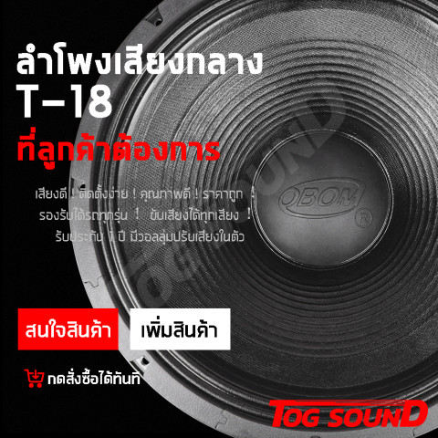 TOG SOUND ดอกลำโพง 18 นิ้ว PA 1200W OBOM TRUMP T-18 (4-8Ω) ดอกลำโพงขนาดใหญ่สำหรับงานกลางแจ้งและงานระบบเสียง PA ให้พลังเสียงแน่น กระแทกชัด เหมาะทั้งทำตู้ซับเบส 18 นิ้ว และงานลำโพงกลางแจ้งที่ต้องการแรงปะทะของย่านต่ำอย่างเต็มอิ่ม ด้วยโครงหล่อแข็งแรง ช่วยลดการสั่นค้างและรองรับการใช้งานหนักได้ดี เหมาะสำหรับนักทำตู้ลำโพง ร้านเครื่องเสียง และทีมงานอีเวนต์ที่ต้องการอัปเกรดเสียงให้ดัง ชัด และทน