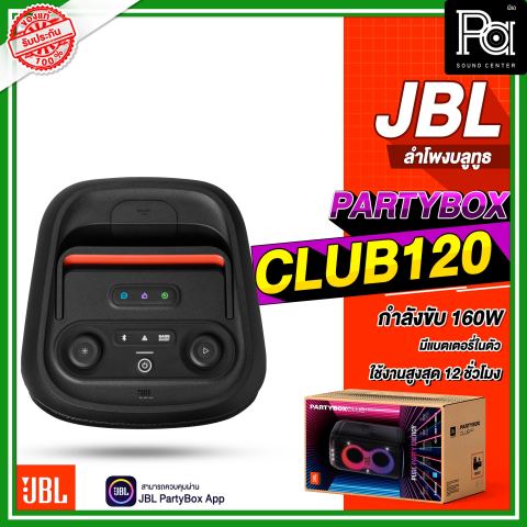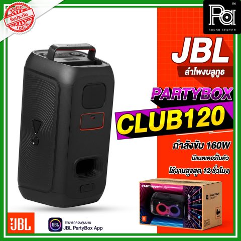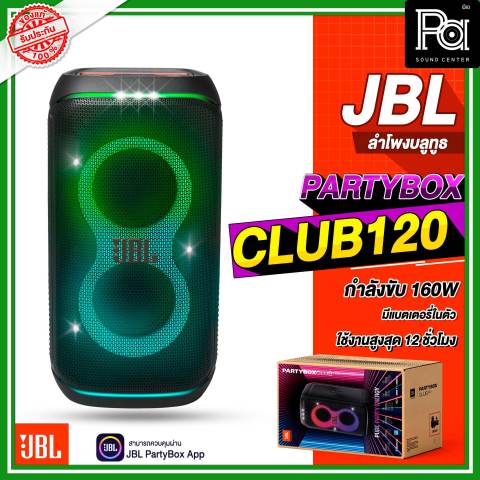 JBL PARTYBOX CLUB 120 ลำโพงบลูทูธพกพาสายปาร์ตี้ กำลังขับ 160 วัตต์ ให้เสียงดังชัด เบสแน่น เติมบรรยากาศให้สนุกได้ทุกที่ทั้งในบ้าน ปาร์ตี้สวน หรือทริปนอกสถานที่ พร้อมแบตเตอรี่ใช้งานได้นานสูงสุด 12 ชั่วโมง และ Fast Charge ชาร์จไว เพิ่มความต่อเนื่องของความมันส์แบบไม่สะดุด