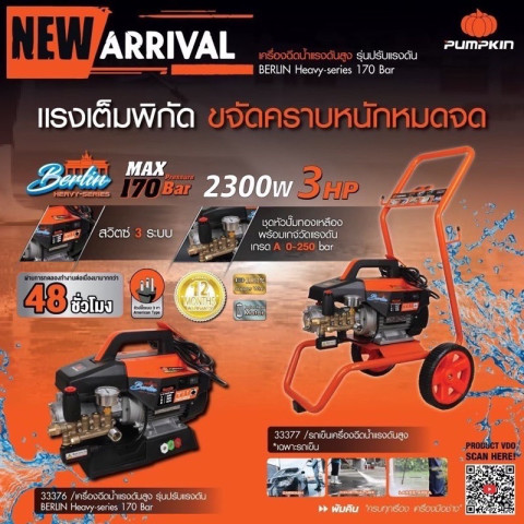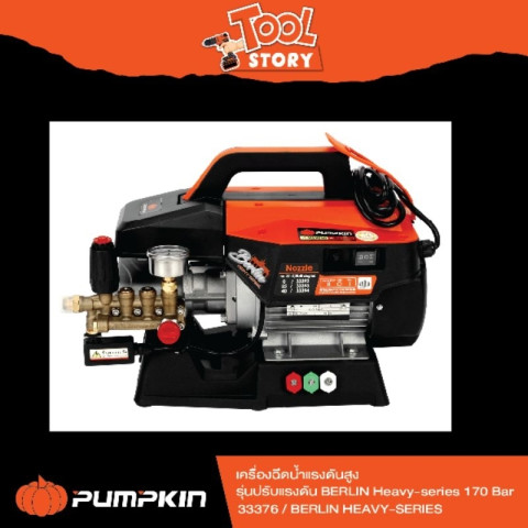 PUMPKIN Berlin 170bar เครื่องฉีดน้ำแรงดันสูง Heavy Series ปรับแรงดันได้ (33376) รุ่นงานหนักที่ตอบโจทย์ทั้งงานล้างรถ ล้างพื้นคราบตะไคร่ และงานทำความสะอาดพื้นที่กว้าง ให้แรงดันสูงสุดถึง 170 bar พร้อมอัตราน้ำไหลแรง 660 L/hr (11 L/min) ช่วยขจัดคราบฝังแน่นได้ไว ประหยัดเวลา และใช้งานสะดวกด้วยชุดอุปกรณ์ครบ พร้อม รถเข็น สำหรับเคลื่อนย้ายคล่องตัว