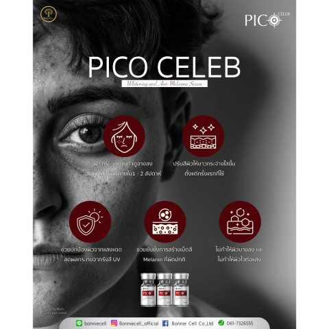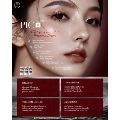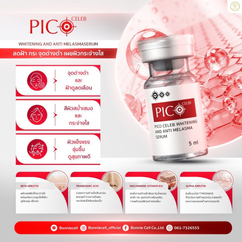 𝐏𝐈𝐂𝐎 𝐂𝐄𝐋𝐄𝐁 WHITENING AND ANTI MELASMA SERUM เซรั่มดูแลฝ้า กระ และจุดด่างดำแบบเข้มข้น ช่วยให้ผิวดูกระจ่างใสขึ้นอย่างเป็นธรรมชาติ โดยไม่ทำให้ผิวบาง ไม่แสบ และไม่ทำให้ผิวไวต่อแสง เหมาะสำหรับผู้ที่ต้องการฟื้นฟูผิวหมองคล้ำให้กลับมาดูเรียบเนียน สุขภาพดี
