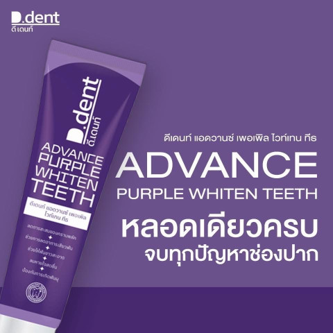 ยาสีฟันดีเดนท์ สูตรใหม่ แอดวานซ์ เพอเพิล ไวท์เทน ทีธ (ดีเดนท์ม่วง) ยาสีฟันเพื่อรอยยิ้มขาวสะอาดอย่างมั่นใจ ช่วยดูแลช่องปากแบบครบจบในหลอดเดียว ทั้งลดคราบพลัค ลดเสียวฟัน พร้อมมอบลมหายใจสดชื่น เหมาะสำหรับใช้เป็นประจำทุกวัน