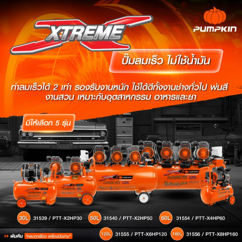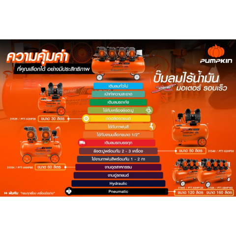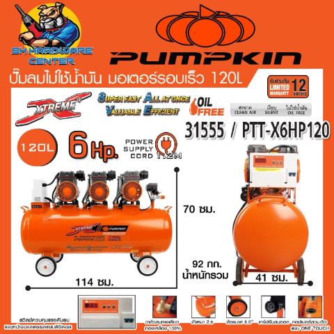 ปั้มลม PUMPKIN Oil Free แรงดันสูง 6 แรงม้า ถัง 120 ลิตร รุ่น 31555 / PTT-X6HP120 ราคา 15,900.00 บาท