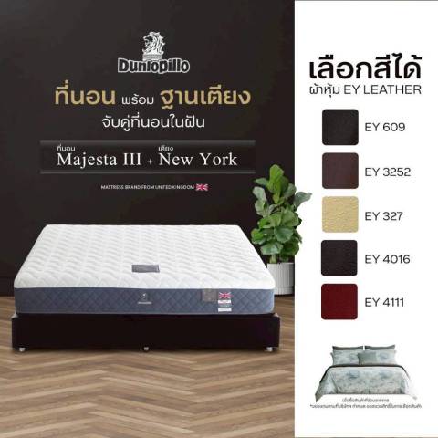 [จับคู่สุดคุ้ม] Dunlopillo ที่นอนพร้อมฐานเตียงหุ้มหนัง รุ่น MAJESTA III x NEW YORK ในราคา 11,408.15 บาท เติมเต็มการนอนให้สบายแบบ “แน่นสบาย” พร้อมลุคห้องนอนเรียบหรูด้วยฐานเตียงหุ้มหนัง รุ่น New York โครงสร้างแข็งแรง เหมาะสำหรับคนที่ต้องการเซ็ตที่นอน+ฐานเตียงครบจบในครั้งเดียว