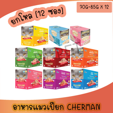 [ยกโหล x 12ซอง] Cherman pouch อาหารแมวเปียกเชอร์แมน ขนาด 85g (รวม 12 ซอง) คุ้มค่าสำหรับบ้านที่มีน้องแมวหลายตัวหรือผู้ที่ต้องการตุนอาหารไว้ใช้งานต่อเนื่อง ในราคา 733.00 บาท อาหารเปียกเนื้อเนียน กลิ่นหอม กินง่าย ช่วยเพิ่มความน่ากินให้มื้อโปรด เหมาะสำหรับใช้เป็นมื้อหลักหรือมื้อเสริม เพื่อให้น้องแมวได้รับความอร่อยพร้อมความชุ่มชื้นในทุกวัน