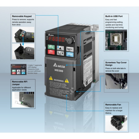 MS300 ซีรีส์ขึ้นชื่อด้านความทนทาน และการควบคุมที่แม่นยำ รองรับการใช้งานต่อเนื่องในสภาพแวดล้อมอุตสาหกรรม เหมาะสำหรับงานปั๊ม พัดลม สายพานลำเลียง เครื่องแพ็คกิ้ง เครื่อง CNC และอุปกรณ์อัตโนมัติอื่นๆ โดยผู้ใช้งานสามารถเชื่อมต่อกับอุปกรณ์ควบคุมและ HMI ได้อย่างยืดหยุ่น (ชุดปุ่มควบคุม/หน้าจอ Operator Control แยกจำหน่าย)