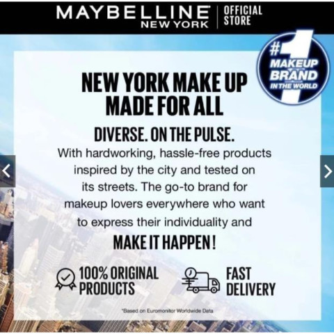 Maybelline New York เมย์เบลลีนนิวยอร์กเป็นแบรนด์เครื่องสำอางอันดับหนึ่งของโลก มีวางจำหน่ายในกว่า 120 ประเทศทั่วโลก ด้วยการผสมผสานสูตรที่ล้ำหน้าทางเทคโนโลยีกับความเชี่ยวชาญตามเทรนด์จากมหานครนิวยอร์ก พันธกิจของ Maybelline New York คือการนำเสนอเครื่องสำอางนวัตกรรมใหม่ที่เข้าถึงได้ ใช้ง่าย และเหมาะสำหรับผู้หญิงทุกคน