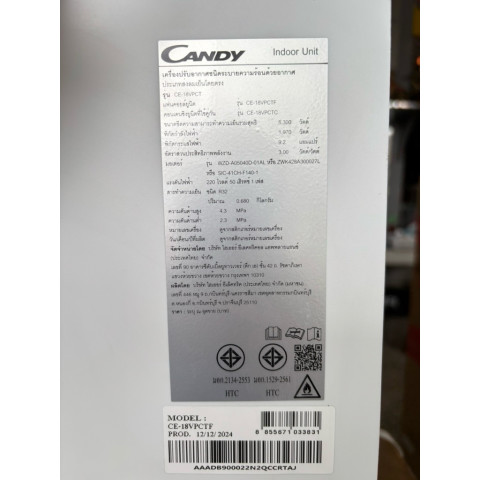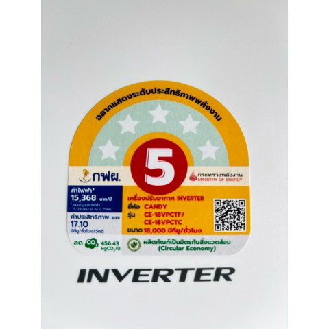 แอร์ Candy 18,000 BTU ระบบ Inverter ของใหม่แกะกล่อง สินค้าพร้อมส่ง ในราคาคุ้มค่า 10,250.00 บาท เหมาะสำหรับผู้ที่ต้องการแอร์เย็นไว ทำงานเงียบ และประหยัดไฟแบบจริงจังด้วย ฉลากประหยัดไฟเบอร์ 5 ใช้เทคโนโลยีอินเวอร์เตอร์ช่วยรักษาอุณหภูมิให้คงที่ ลดการกินไฟเมื่อใช้งานต่อเนื่อง พร้อมความมั่นใจด้วยการรับประกันยาวนาน