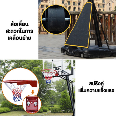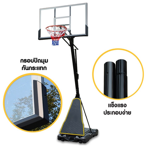 ตัวแป้นบาสมีน้ำหนักประมาณ 46 กก. โครงสร้างแน่นหนา มีอายุการใช้งานยาวนาน คุ้มค่า สามารถเคลื่อนย้ายได้เมื่อถ่ายน้ำออกจากฐาน เหมาะสำหรับผู้ที่ต้องการแป้นบาสเคลื่อนย้ายได้ แต่ยังคงต้องการความมั่นคงแข็งแรงในขณะเล่นการรับประกันและบริการหลังการขาย