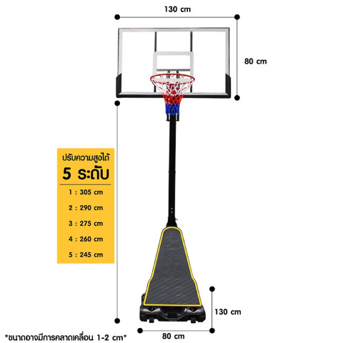 ความสูงจากฐานถึงห่วงบาสปรับได้ตั้งแต่ 245 ซม. ถึง 305 ซม. ซึ่งเป็นความสูงมาตรฐานสนามแข่งขัน เหมาะสำหรับ:ความสูงระดับต่ำ: สำหรับเด็กและผู้เริ่มต้นฝึกพื้นฐานการชู้ต