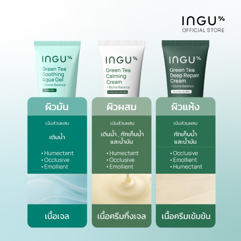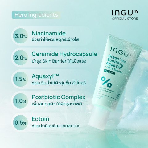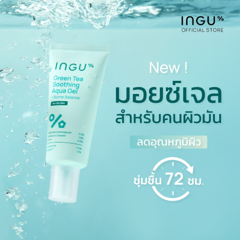 INGU Green Tea Soothing Aqua Gel + Biome Balance มอยซ์เจอร์ไรเซอร์เนื้อเจลบางเบา สำหรับผิวมันและผิวผสม ช่วยเติมความชุ่มชื้นแบบไม่เหนอะหนะ พร้อมปลอบประโลมผิวจากความแห้งกร้านและมลภาวะภายนอก เหมาะสำหรับคนที่มองหาสกินแคร์ที่ให้สัมผัสเย็นสบาย ผิวรู้สึกสดชื่นทันทีที่ใช้