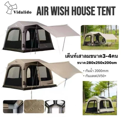 Vidalido Air Tent Wish House เต็นท์เสาลมรุ่นอัพเกรด ที่ออกแบบมาเพื่อการแคมป์ปิ้งแบบสบายๆ สำหรับครอบครัวและกลุ่มเพื่อน 4-5 คน ใช้งานง่าย แข็งแรง ทนทาน กันแดดกันฝนได้ดี มาพร้อมการรับประกัน 1 ปี ของแท้ 100% ให้คุณมั่นใจได้ในทุกทริปแคมป์ปิ้ง