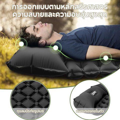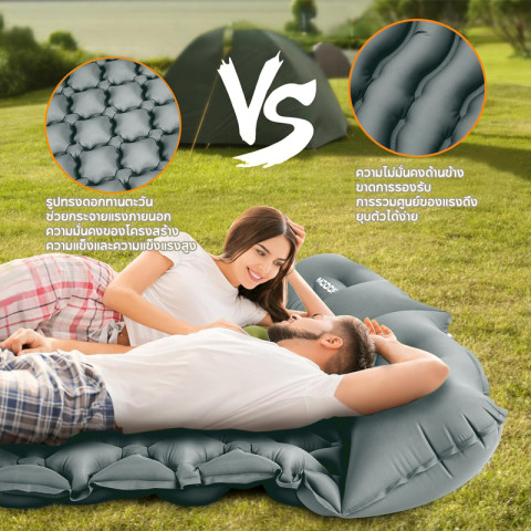ตัวที่นอนถูกออกแบบให้มีโครงสร้างภายในแบบสามมิติ ช่วยกระจายน้ำหนักให้รองรับทุกส่วนของร่างกายได้อย่างสมดุล นุ่มเด้ง “กดแล้วเด้งเหมือนฝัน” ลดอาการปวดหลังและไม่ทำให้เมื่อยล้าเมื่อต้องนอนกลางแจ้งหลายคืนต่อเนื่อง พร้อมหมอนในตัว ช่วยพยุงศีรษะและต้นคอ ให้คุณหลับลึกได้ยาวนานยิ่งขึ้น