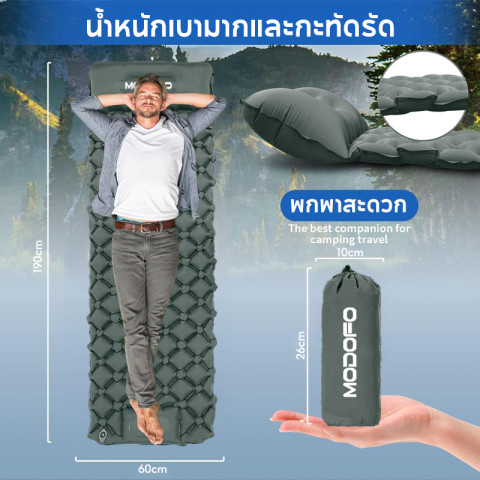 ด้วยดีไซน์กะทัดรัด น้ำหนักเบาแต่แข็งแรง พร้อมคุณสมบัติป้องกันความเย็นและความชื้น MODOFO ที่นอนลมกลางแจ้งพร้อมหมอนจึงเป็นไอเท็มที่คนรักการท่องเที่ยวกลางแจ้งไม่ควรพลาด พกไปได้ทุกที่ นอนสบายได้ทุกเวลาในราคาเพียง 601.17 บาท คุ้มค่าและตอบโจทย์ทุกทริปของคุณ