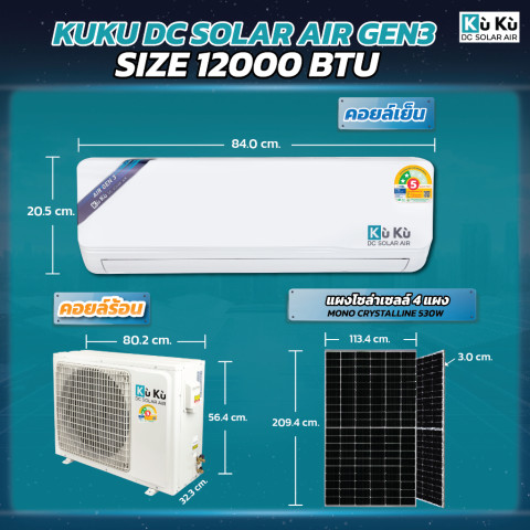 เครื่องปรับอากาศ KUKUairgen3 ขนาด 12,000 BTU รุ่น Wall Type พร้อมชุดแผงโซล่าเซลล์ MONO 530W จำนวน 4 แผง รวมกำลัง 2.12 KW คือโซล่าแอร์ยุคใหม่ที่ออกแบบมาเพื่อการประหยัดพลังงานสูงสุด ติดตั้งใช้งานได้ทั้งบ้านและธุรกิจ ใช้พลังงานแสงอาทิตย์ได้เต็มประสิทธิภาพ แม้ในกรณีไฟฟ้าบ้านดับก็ยังเย็นต่อเนื่อง ช่วยลดค่าไฟฟ้าได้มหาศาลในระยะยาว